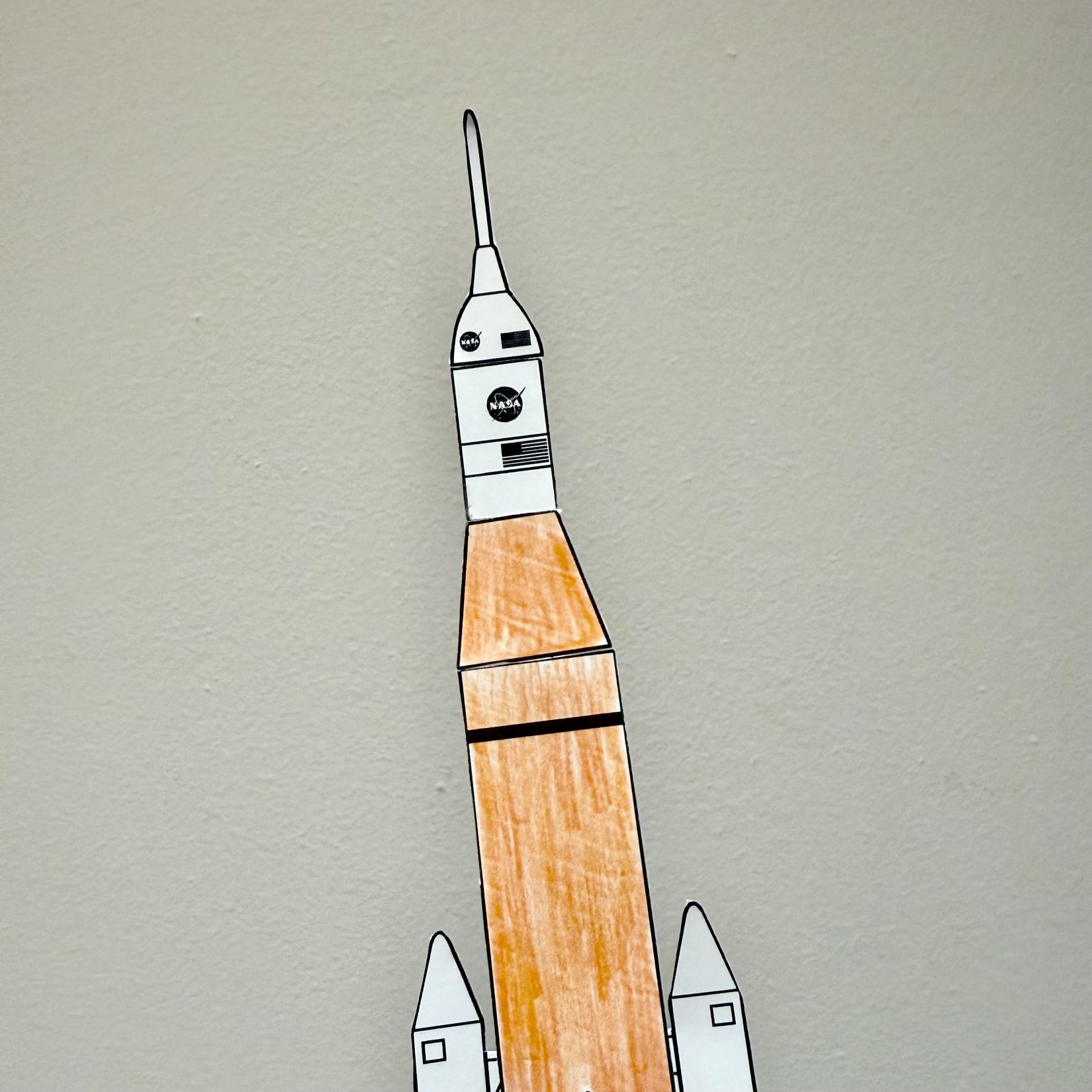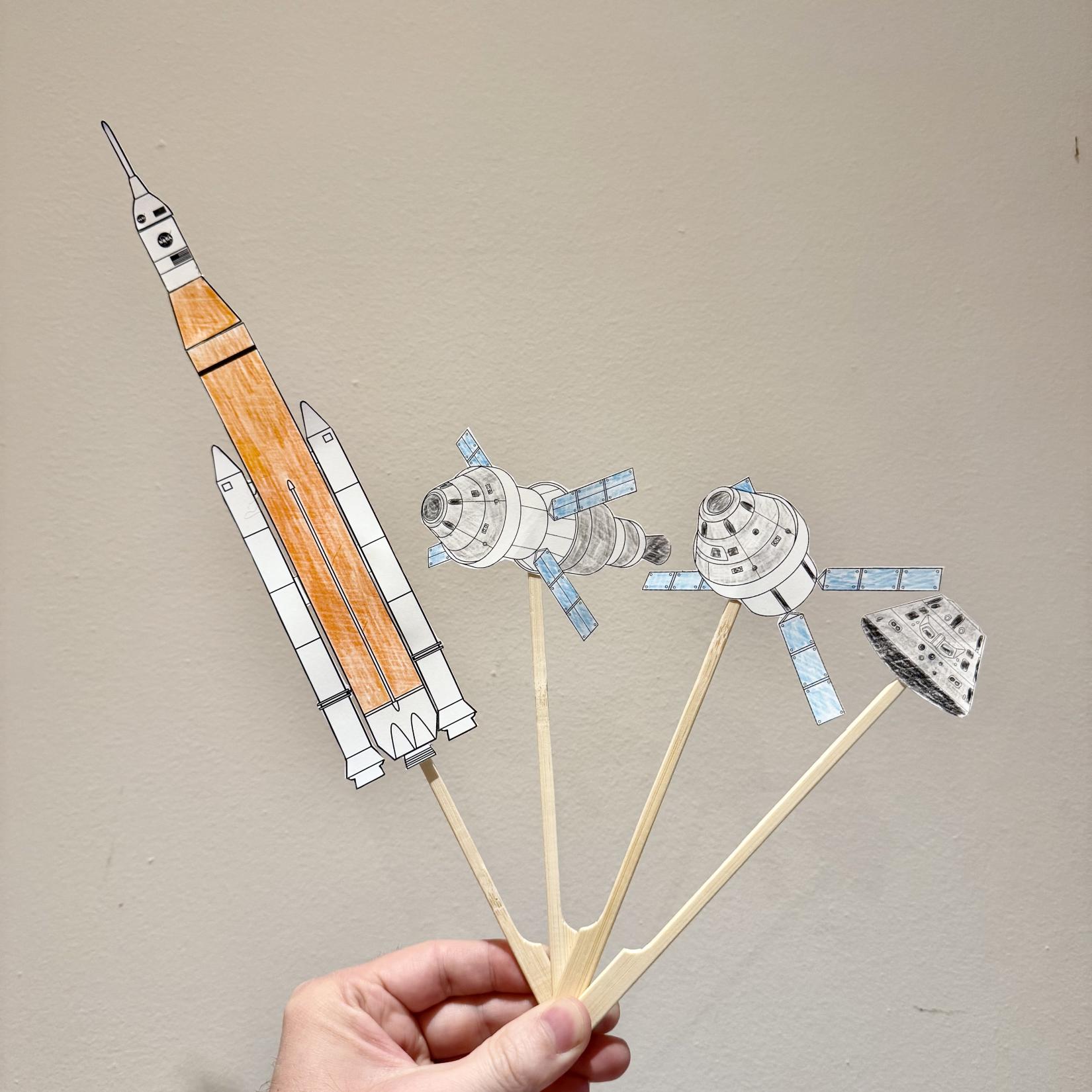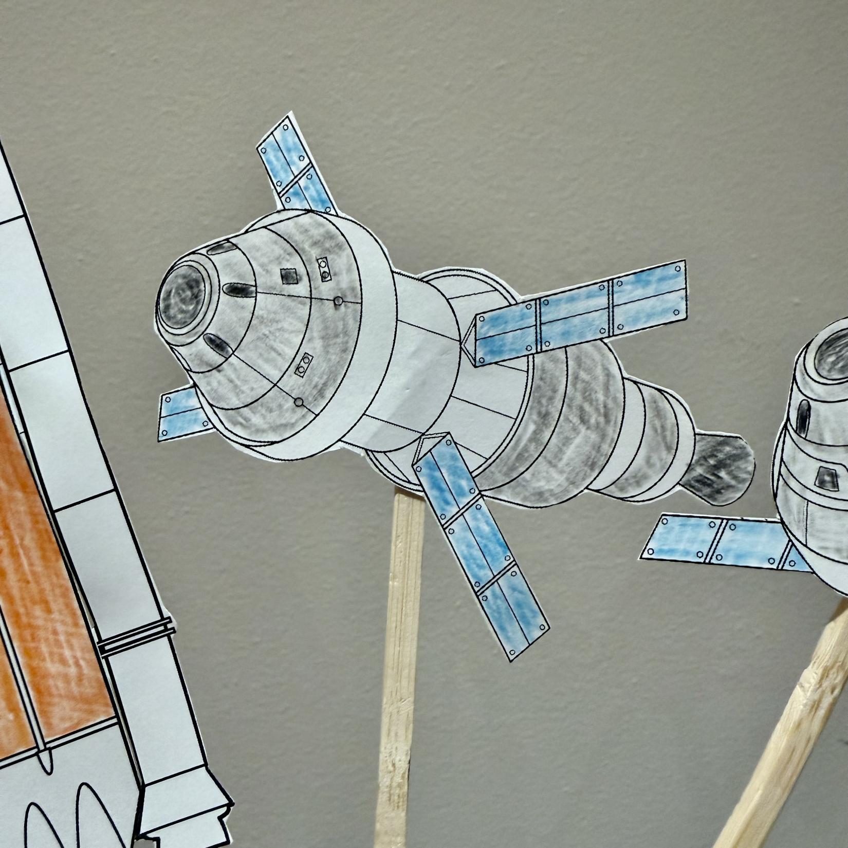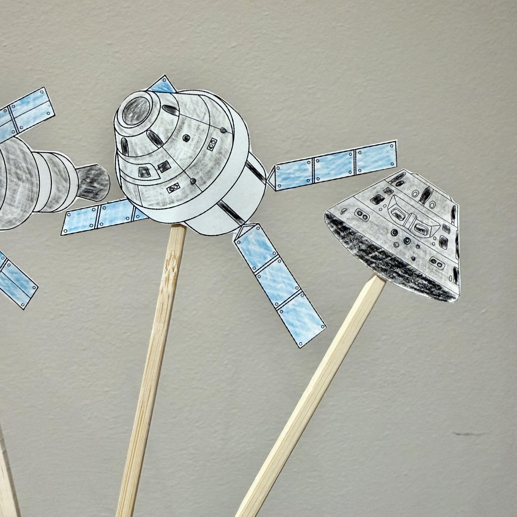 The students will cut out pieces of paper and colour each of the major phases of the spaceflight. Then, they will tape wooden sticks to the back of each paper and can recreate the mission.